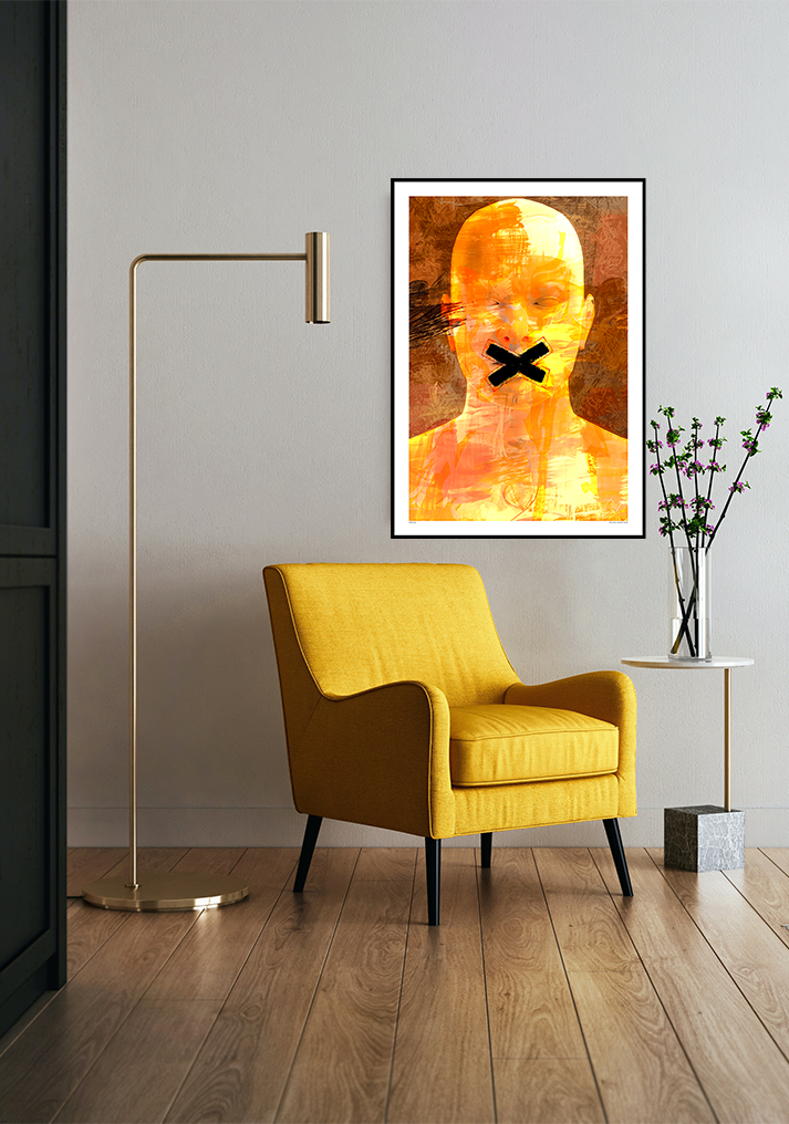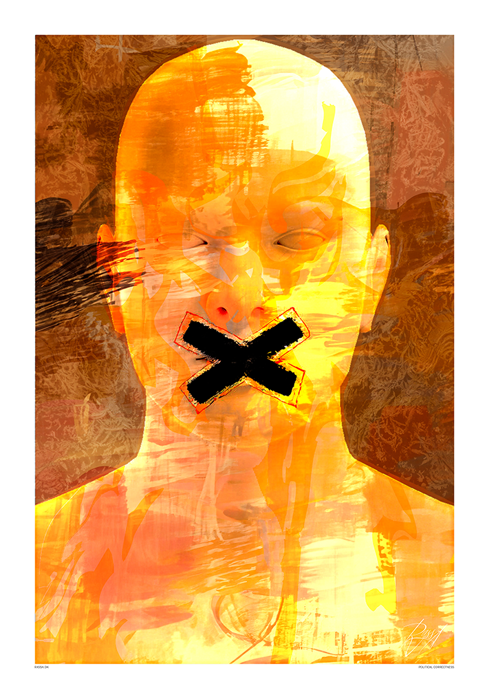 Political Correctness er et visuelt råb om retten til at tale åbent. Den glatte, næsten anonyme maske er badet i varme nuancer af gul og orange – liv, energi, vilje – men tværs over munden ligger et råt, sort X. Det mærke skærer sig igennem overfladen og gør pointen enkel: når vi forbyder ubehagelige ord, forsvinder ikke de ubehagelige problemer. Værket peger ikke fingre; det stiller et spørgsmål: Hvordan kan vi forstå hinanden, hvis vi ikke må sige det svære højt?